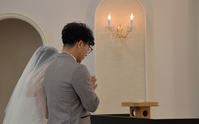 婚礼衣装のままで礼拝堂に参拝し御神像前でお祈りが出来ます
