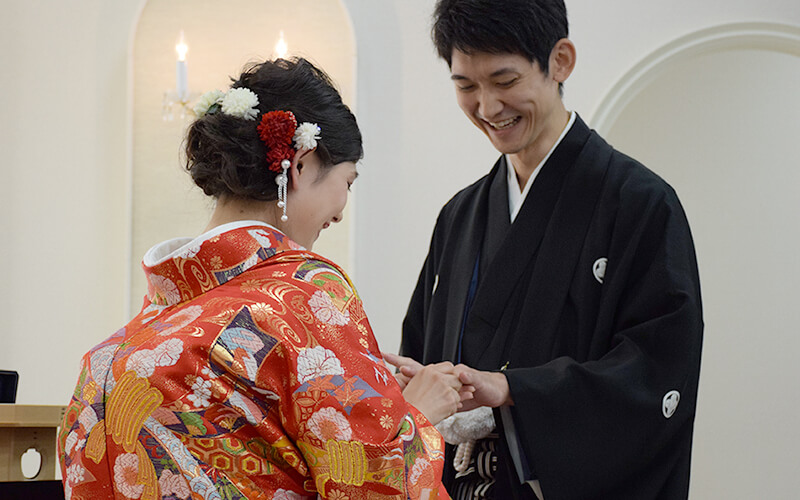 夫婦で指輪の交換を行います